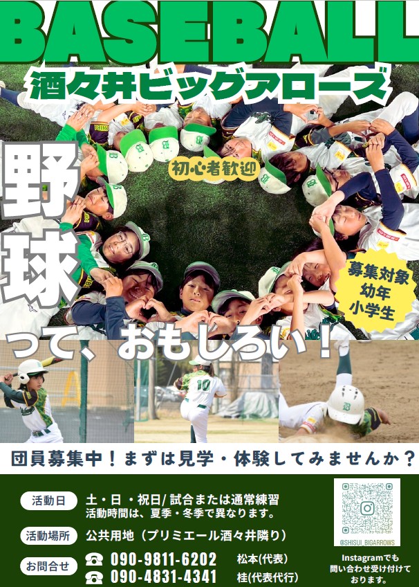 私たちは千葉県印旛郡酒々井町役場近くの公共用地をホームグランドとして活動しています。少年野球の「酒々井ビッグアローズ」です。